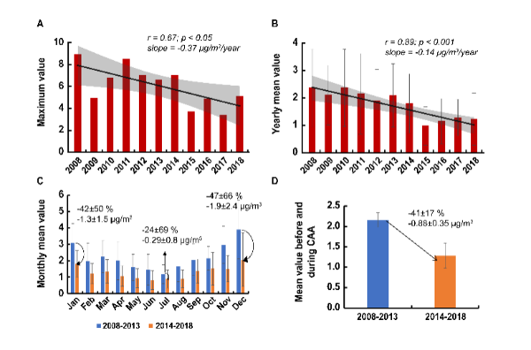 针对这一问题,来自广州地化所、暨南大学、香港科技大学、香港科技大学(广州)、瑞典斯德哥尔摩大学等国内外多个研究机构的科研人员组成联合研究团队,对珠三角2008-2018年连续11年间的大气颗粒物样品进行了系统的放射性碳同位素丰度(¹⁴C)和稳定碳同位素组成(δ¹³C)测量,揭示出大气BC的浓度和来源变化趋势。研究结果显示,珠三角大气BC浓度在2008-2018年间呈显著下降趋势,尤其经“大气十条”的实施,BC浓度大幅降低了41% (图1),表明珠三角在BC减排上取得了重大成就。