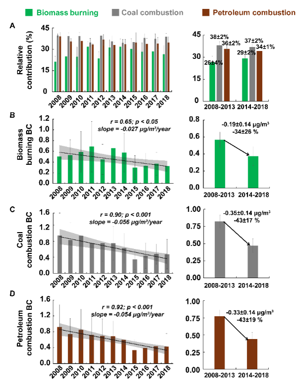 基于Δ14C-δ13C同位素数据集并结合贝叶斯模型,团队对2008-2018年间大气BC的来源进行了识别和量化(图2左)。结果表明,燃煤、石油燃烧和生物质燃烧对BC的贡献范围分别为31-44%、28-47%和11-40%。“大气十条”实施期间,不同来源的BC浓度贡献均发生显著下降,其中,燃煤和石油燃烧贡献的BC浓度均下降约43%,生物质燃烧贡献的BC浓度下降了约34%(图2右)。这表明,虽然对三大类BC排放源的管控均取得了显著效果,但珠三角对燃煤、燃油BC排放的管控效果,要更优于对生物质燃烧BC排放的管控。