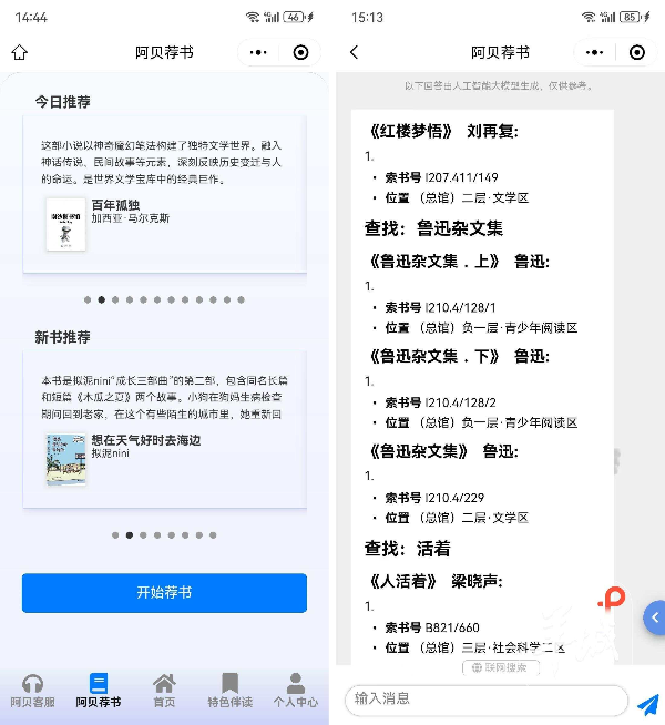 作为全省首个地方文献AI大模型,“阿贝数字人”小程序包含特色伴读、智能客服和个性化荐书三大模块。其技术架构采用“知识中台”设计,可无缝调用馆内专属信息库并实时联网获取外部资讯,提升服务精准度。