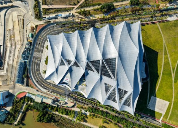 “金属海浪”流畅涌动,钢结构立面如同巨轮上高悬的风帆,勾勒湾区天际线……记者在现场看到,新地标气势万千,如同联通中国与世界的科技方舟。屋面“金属海浪”由26片凹形曲面拼接而成。屋面长170米,宽150米,最大高差达21米。